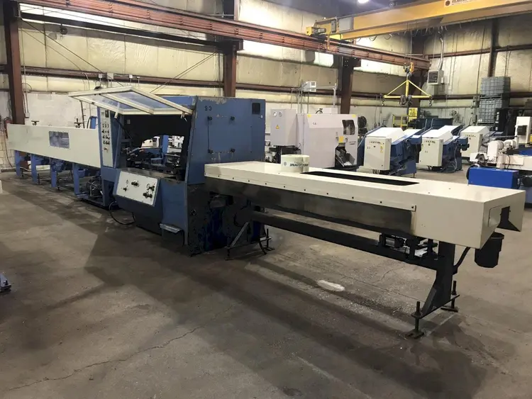 SIMEC CICLOMEC 122 circular cold saw, manufactured in 2001, offers 4 ¾" capacity, 26.5" hitch type feeder, and 20' auto bundle loading rack. Features automatic double-sided exit conveyor, Siemens OP7 CNC control, and material separation.