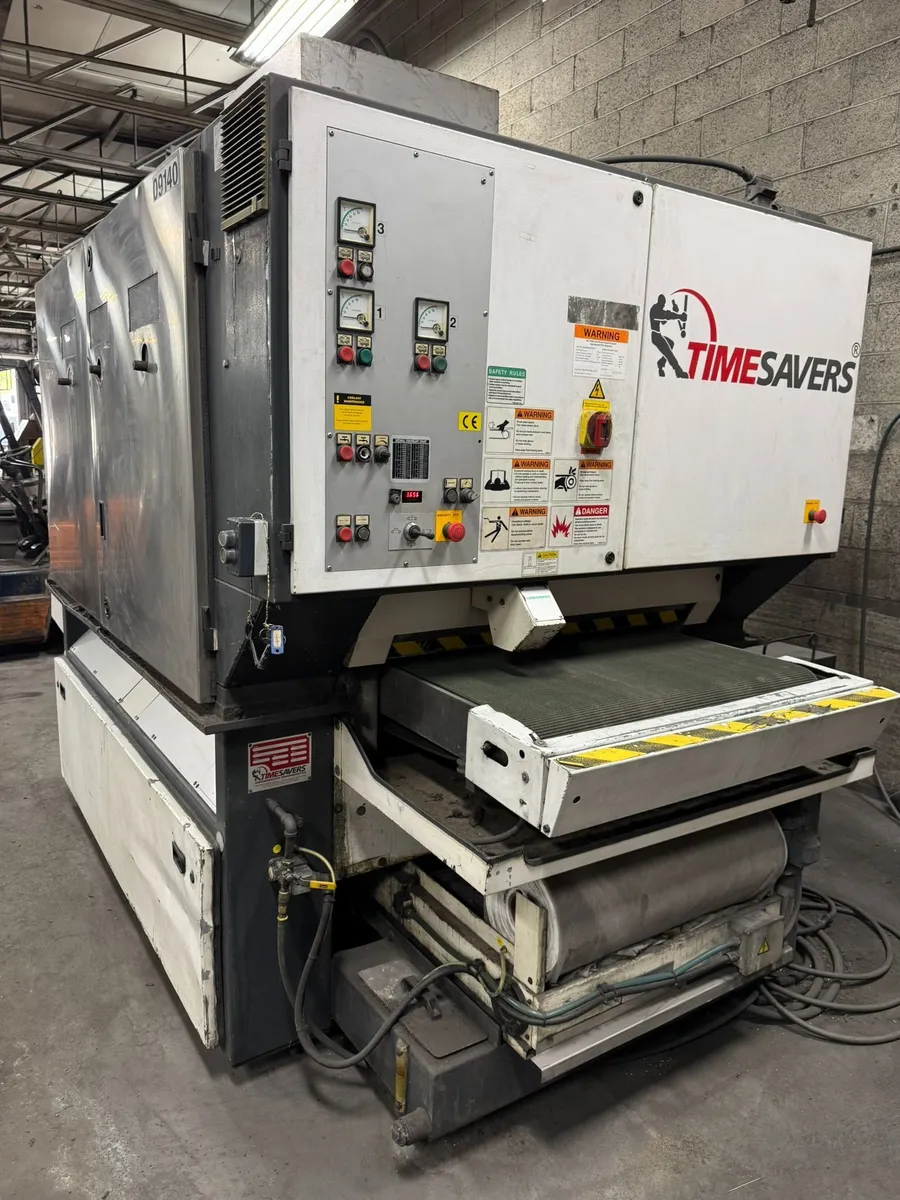 2004 Timesavers 4131-23-000 wet wide belt sander features a 36" belt, 99 HP, and three abrasive heads. Includes air knife dryer, coolant filter, recirculation pump, and automatic belt tracking.